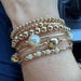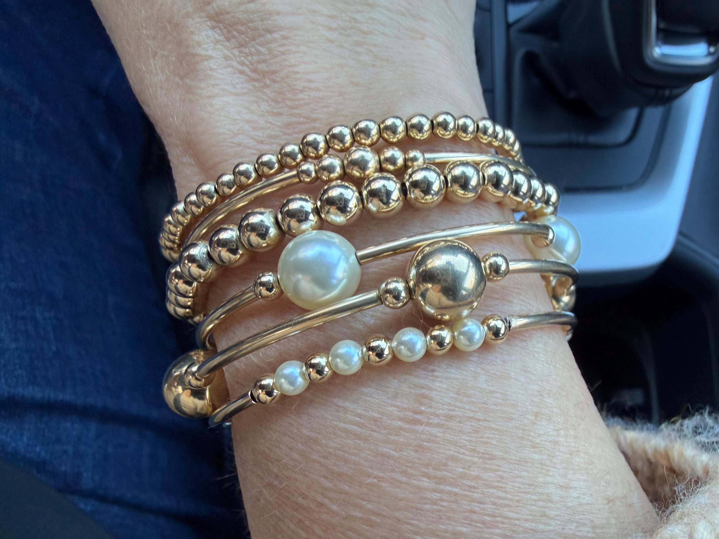 Beautiful 4mm Swarovski Crystal Cream colored pearls and 14k gold filled crescent beads make this bracelet a great seller. Each bracelet comes with Grateful card and organza gift bag. Power stretch cord.