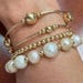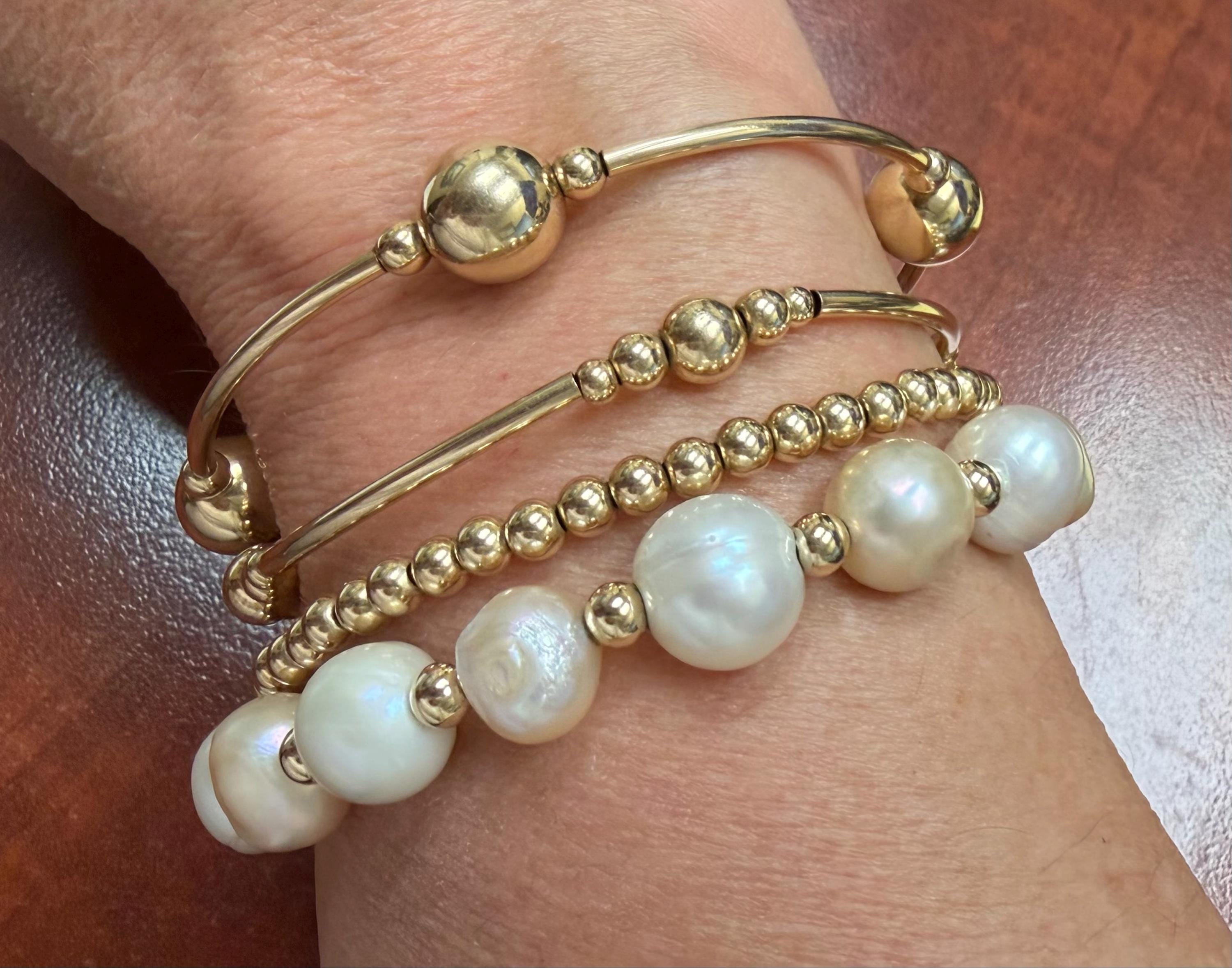 Cream and very, very faint iridescent pink 10mm cultured pearls hand drilled and strung on a power stretch cord. You may choose between sterling silver or 14k gold filled accent beads. This bracelet is a statement piece. It can be worn alone or stacked with other bracelets.