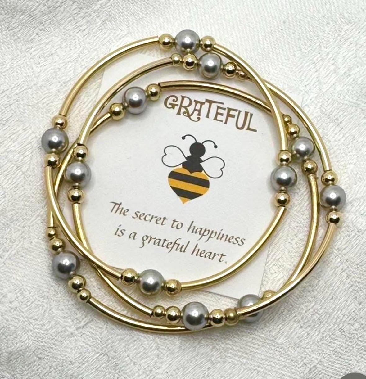 14k gold filled crescent and ball beads with 6mm creamy gray pearls on a stretch cords. A set of 3 bracelets.