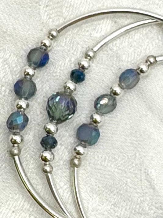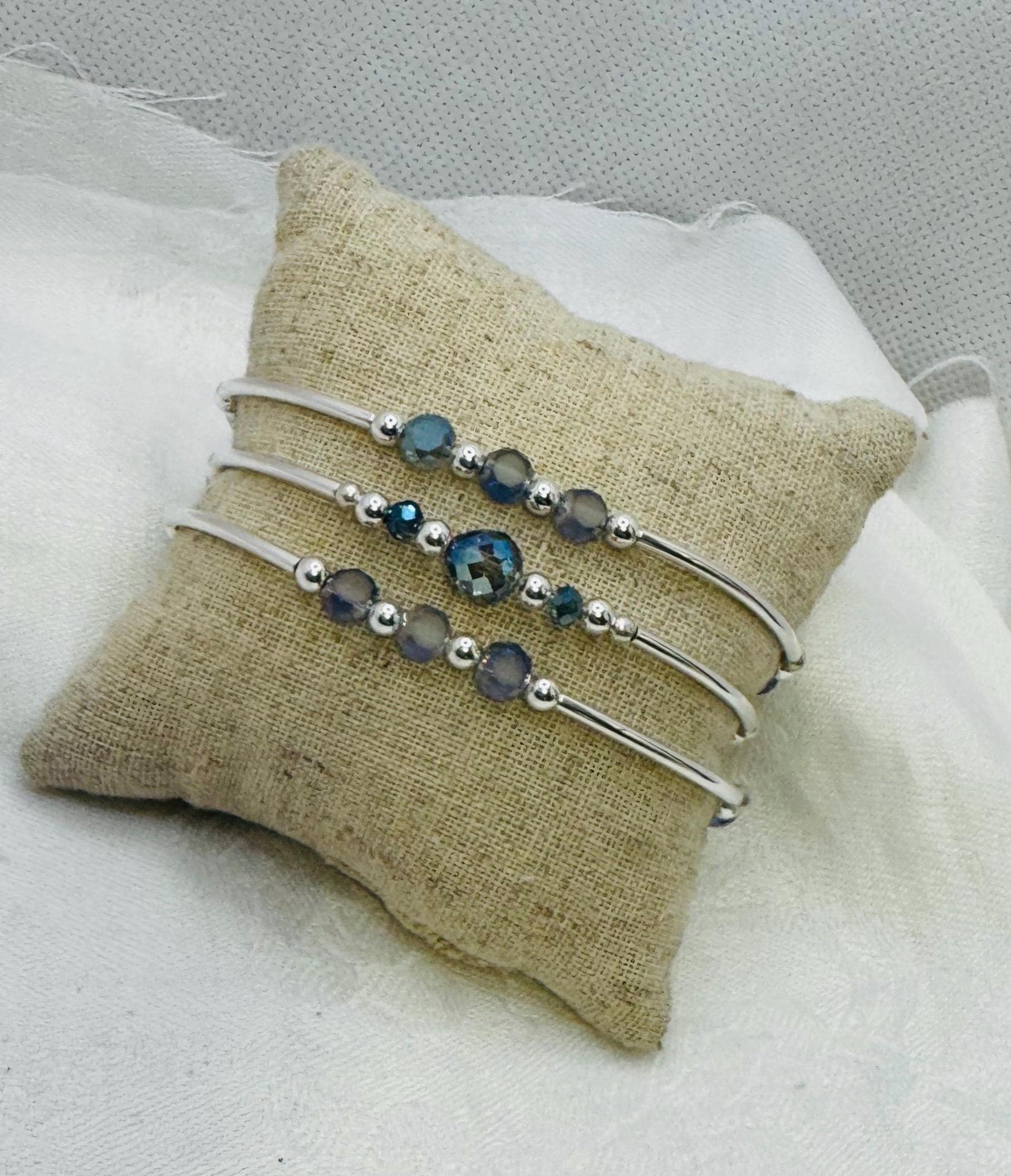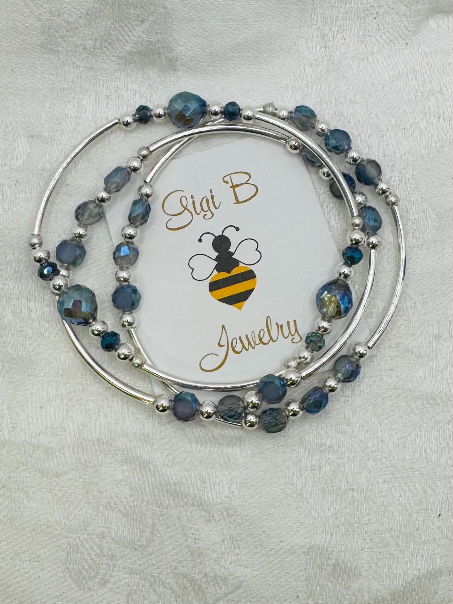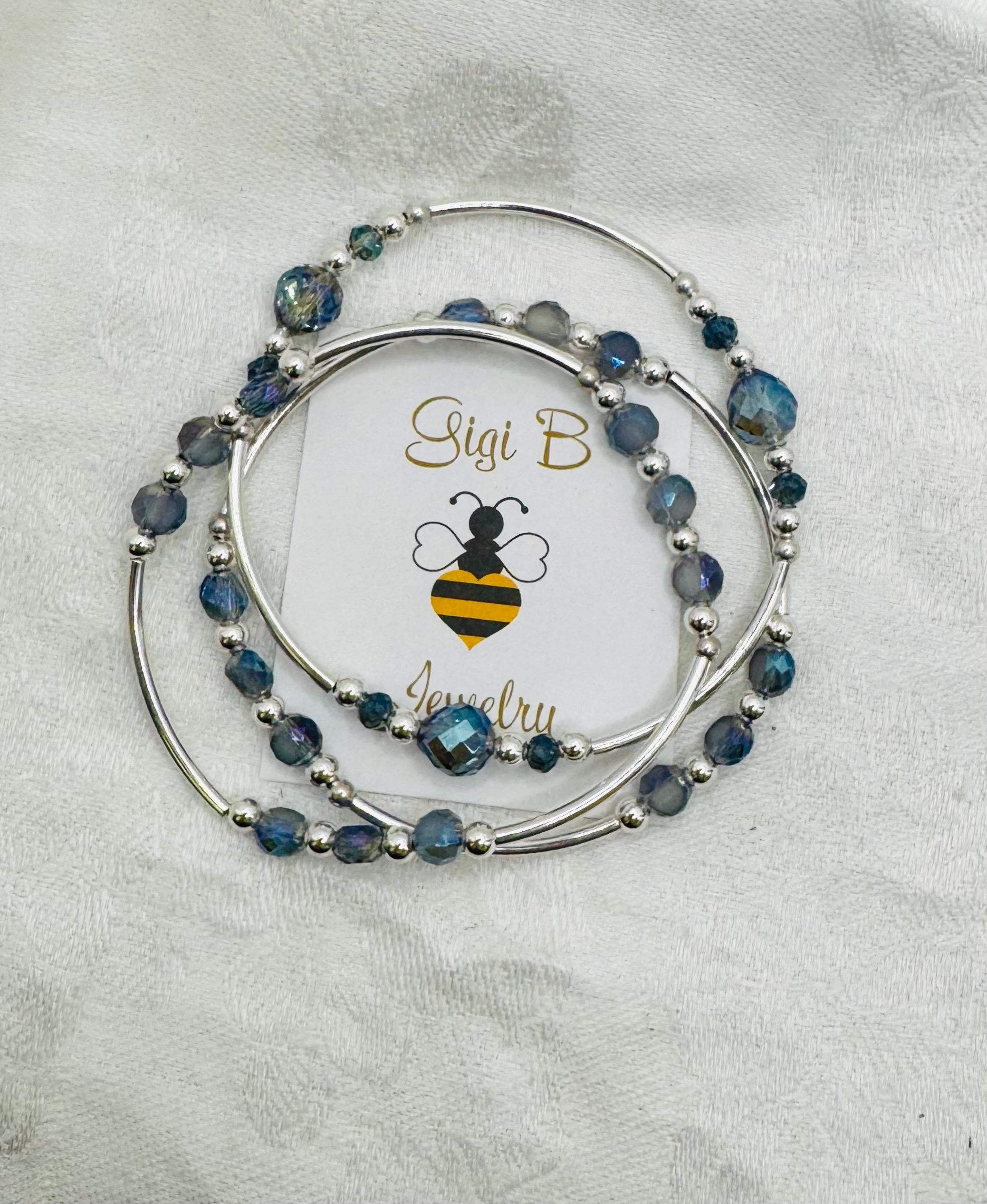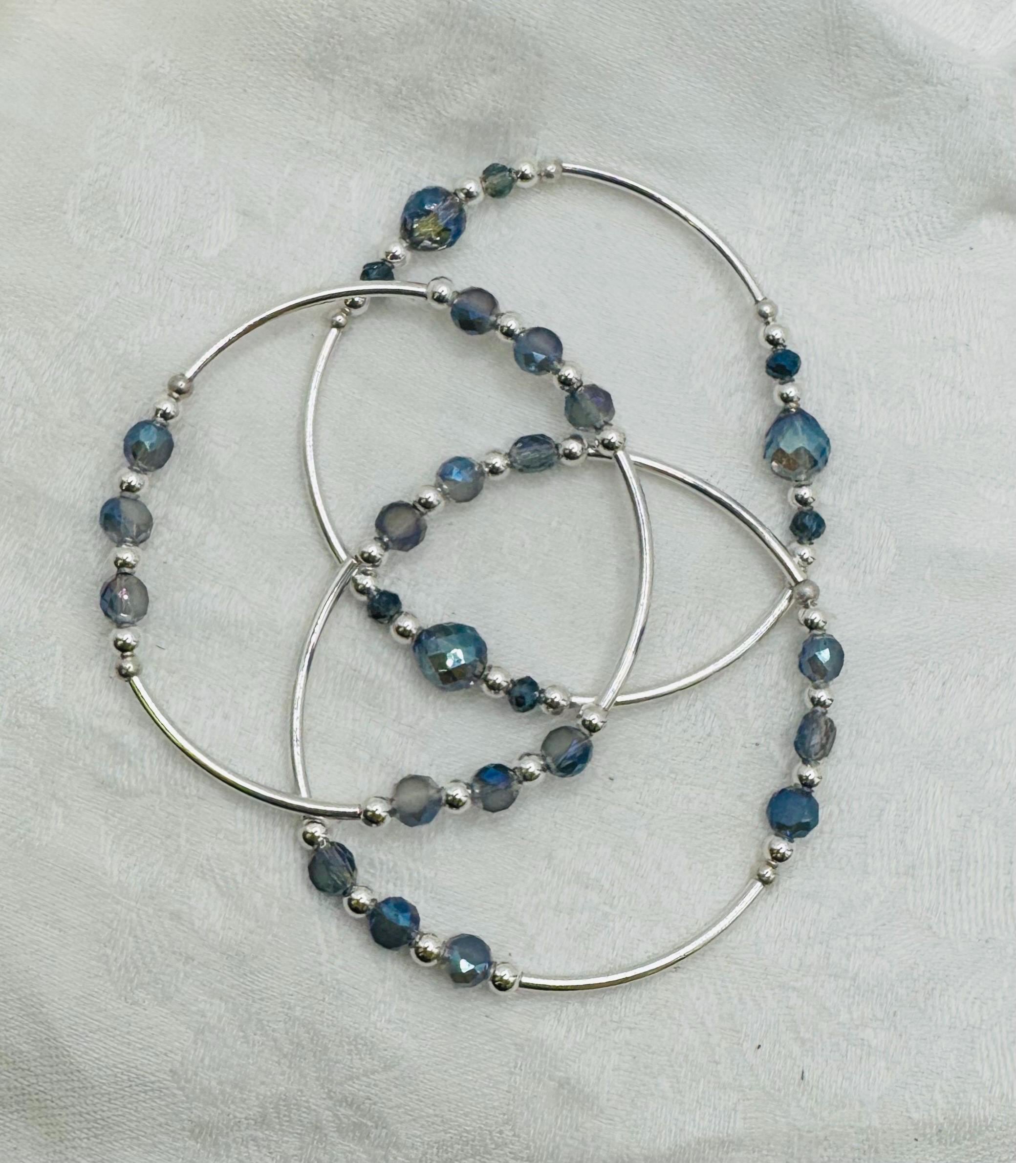 Czech glass blue beads and sterling silver cresent beads handstrung on a power stretch cord. This is a set of 3 bracelets.
